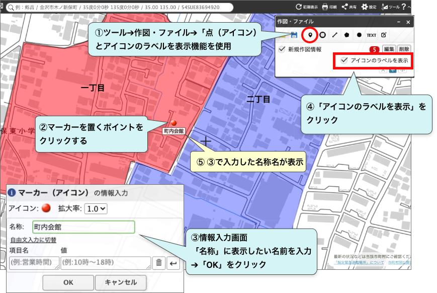 【例】町内の避難場所と町内会館を書き込んでみましょう。