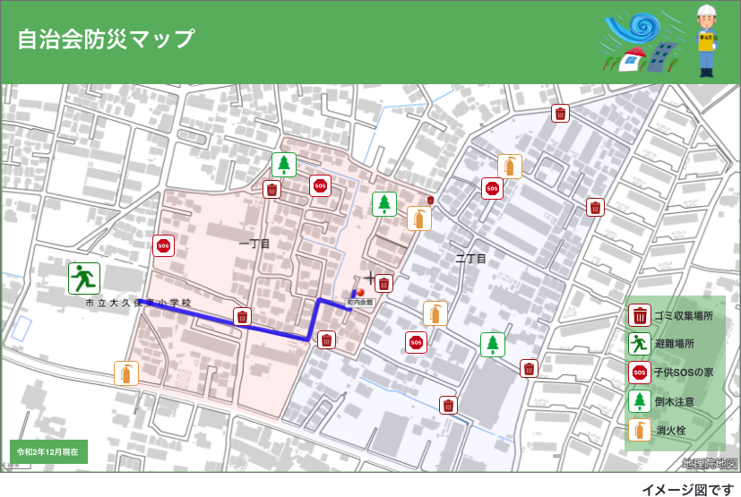 【例】町内会防災マップを作成して、町内会の防災会議に活用してみましょう。