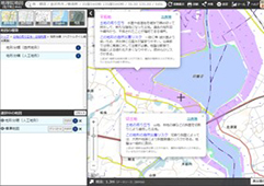 地形分類には、自然地形だけではなく人工地形のデータもあります。地形分類(人工地形)を重ね合わせると、人工的に改変された場所が着色され表示されます。自然地形・人工地形ともに、色のついたところをクリックすると説明がポップアップで表示されます。普段の生活からは見えない土地の状態や自然災害で起こりうるリスクを学ぶことができます。